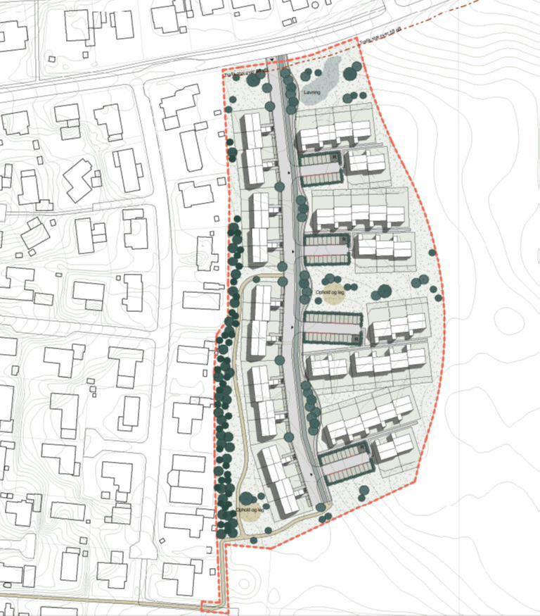 Projektet udformes med hjemmehørende beplantning og grønne fællesrum, der tilpasses terrænet, samt et regnvandsbassin i områdets naturlige lavning. Trafikale vurderinger viser, at et enkelt T-kryds kan håndtere tilkørslen, og at den forventede trafik kan afvikles uden problemer.